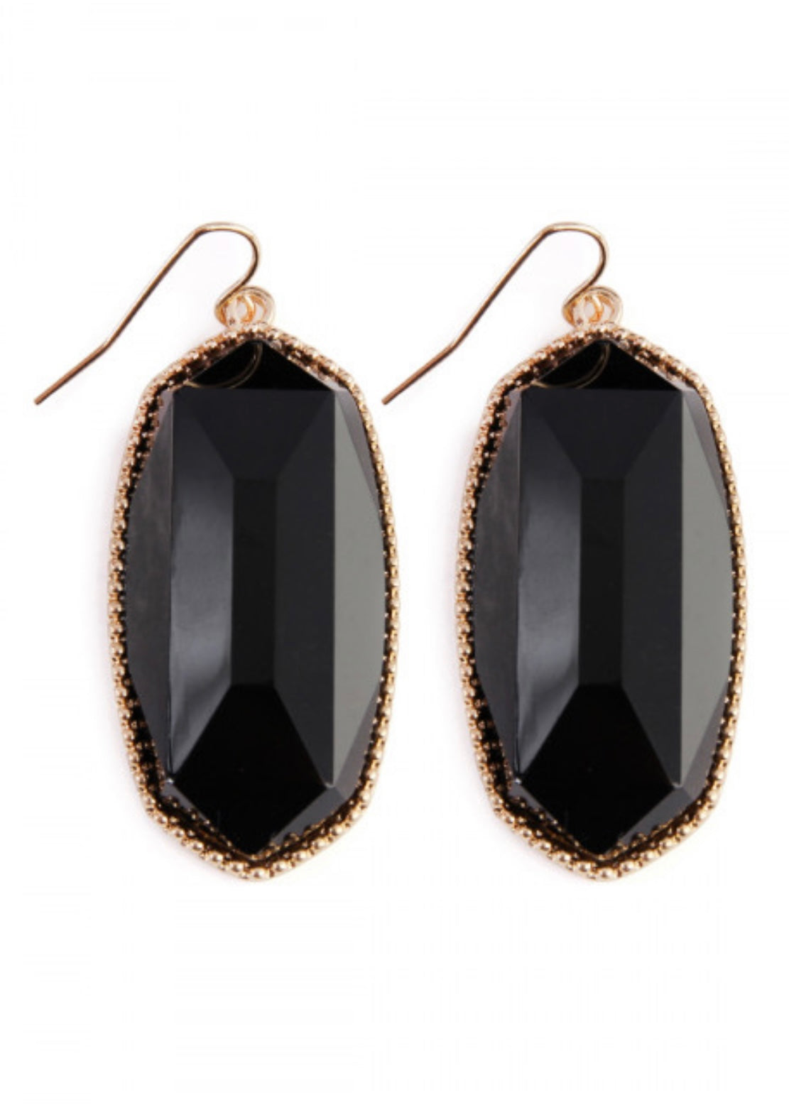 Get ready for your close-up with these black gem cut earrings. They have a large black stone in the center and are outlined in chiseled gold. They do have some weight to them but are not heavy. They look stunning with any color cocktail dress or formal jumpsuit. Be prepared to receive a lot of compliments during your fancy evening party with these black gem cut earrings.