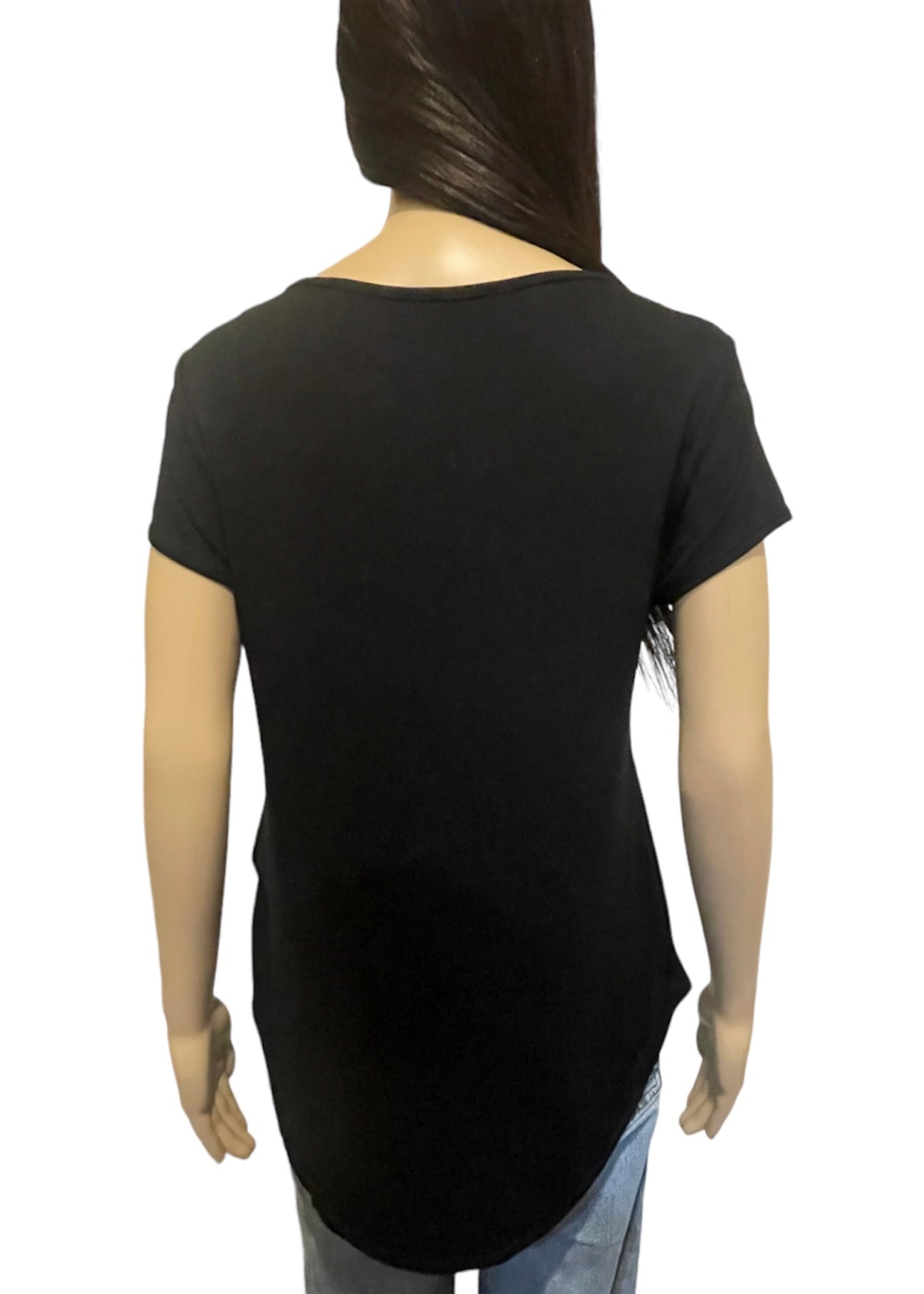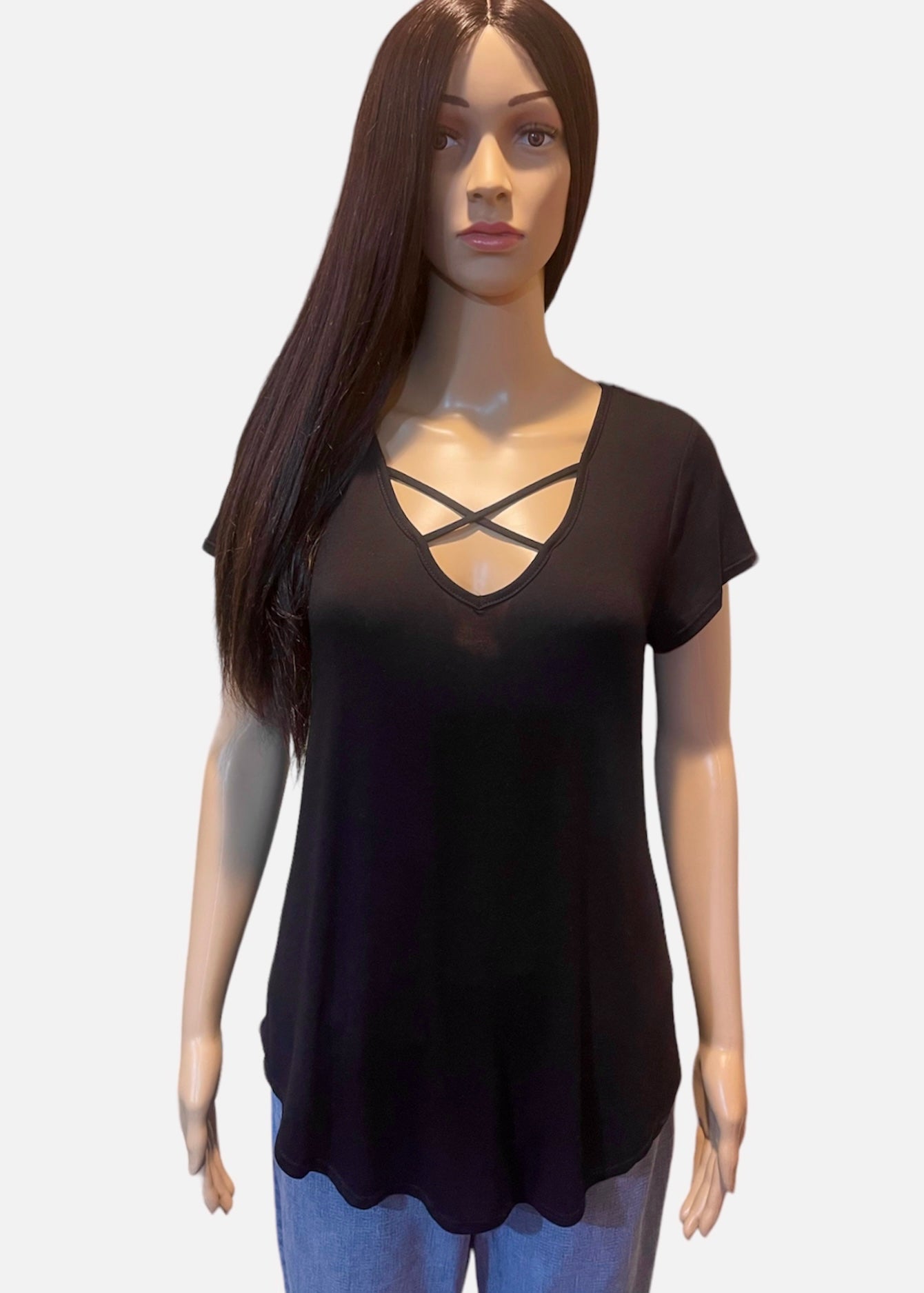 This Anything Goes Black Criss Cross Top is a must-have addition to your wardrobe. The classic black knit and short-sleeve style makes it perfect for transitioning from one season to the next. With a prominent criss cross detail at the front, this basic top is elevated to a stylish and eye-catching piece. It has a longer rounded hem at the bottom which creates a visual interest and it is semi-sheer. Make a statement with this neutral transition piece this season and pair it with a coordinating sweater or jacket in the cooler months to create different looks.
