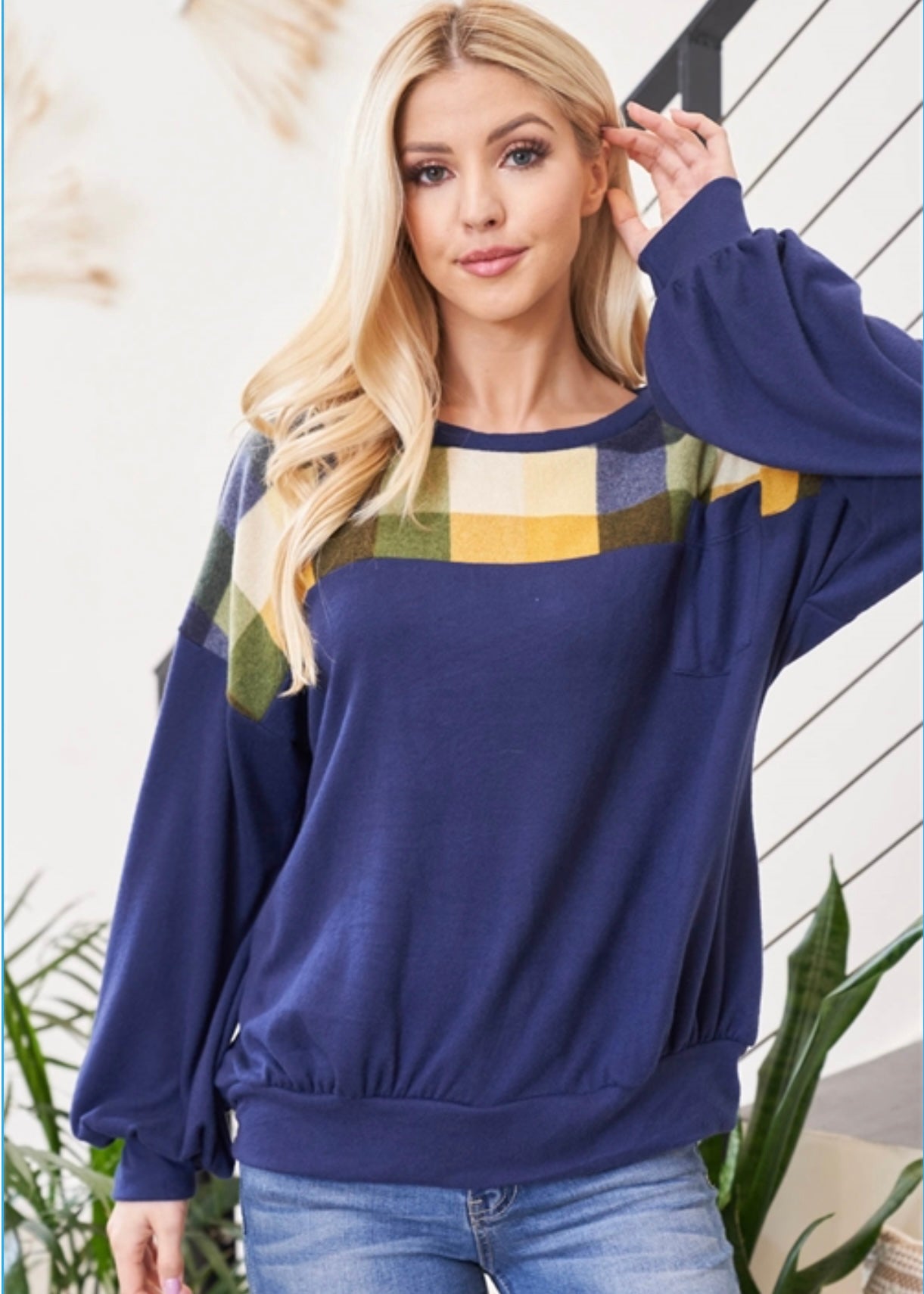 Do you get super excited about cooler temperatures, football season, and apple picking? Get ready to enjoy your outdoor festivities this autumn in this cute navy blue sweater. It has a plaid panel at the top with shades of yellow, green, and blue. It has a pocket on the left chest for added detail. It has a fleece feel, making it so warm and cozy. Observe the colorful autumn leaves and all its beauty in this amazing navy blue sweater.