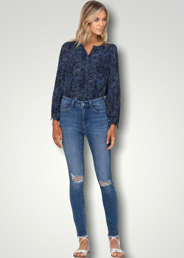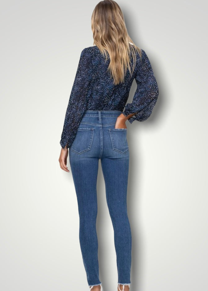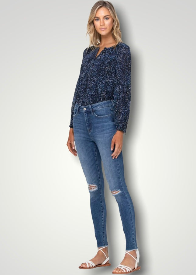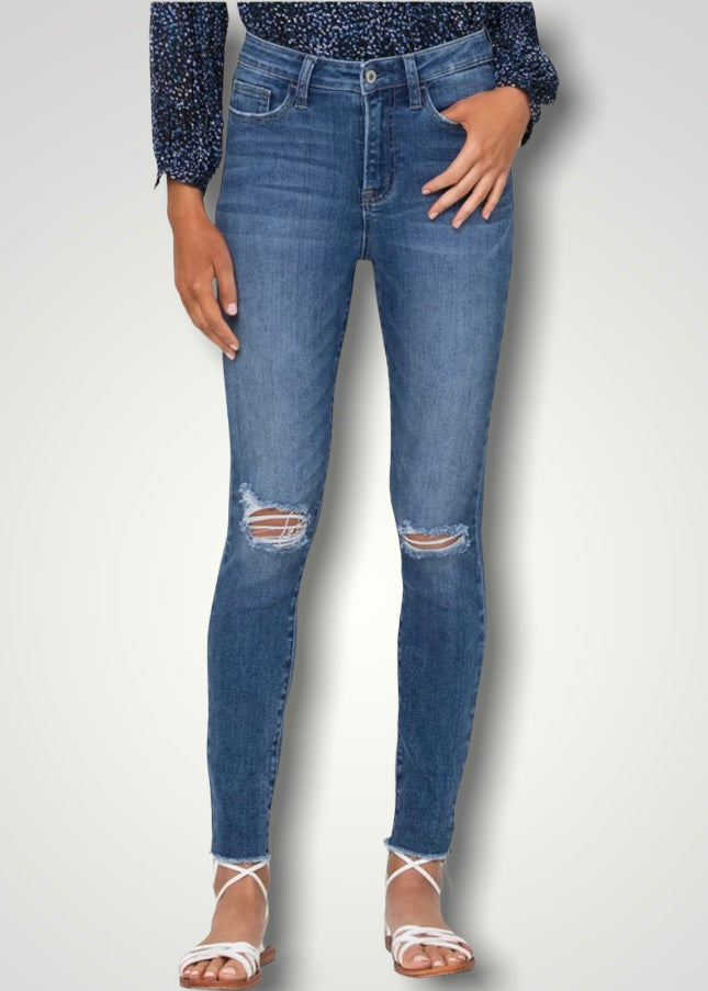 Can we talk about how cute these jeans are? They are so stylish and should be in every woman’s closet. They are high rise which provides a smooth, sleek silhouette and eliminates the unsightly muffin top. They are distressed with rips at the knees and have a raw hem, making them very hip and on trend.