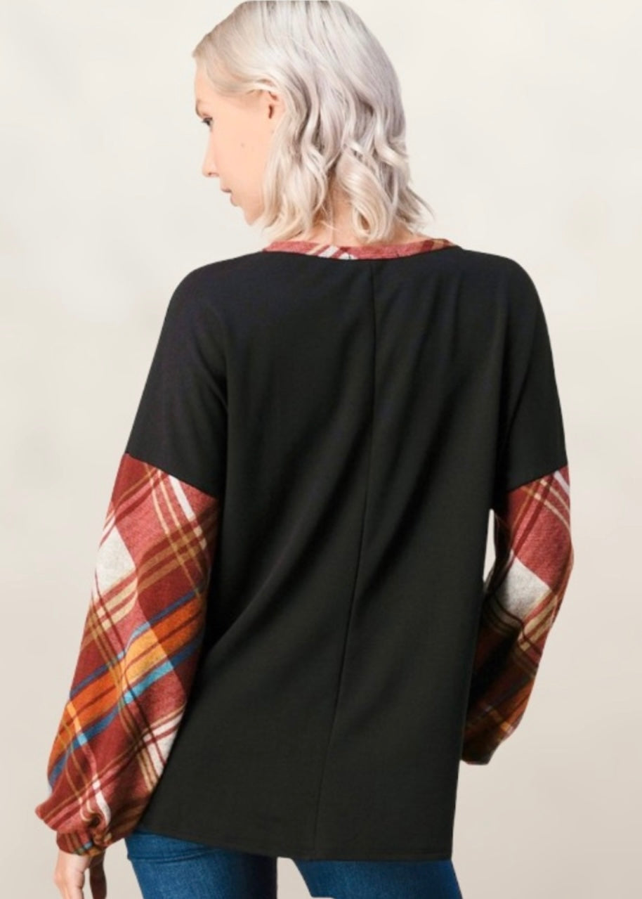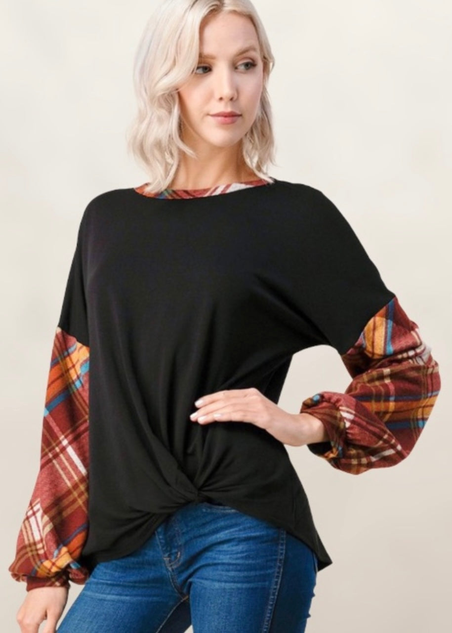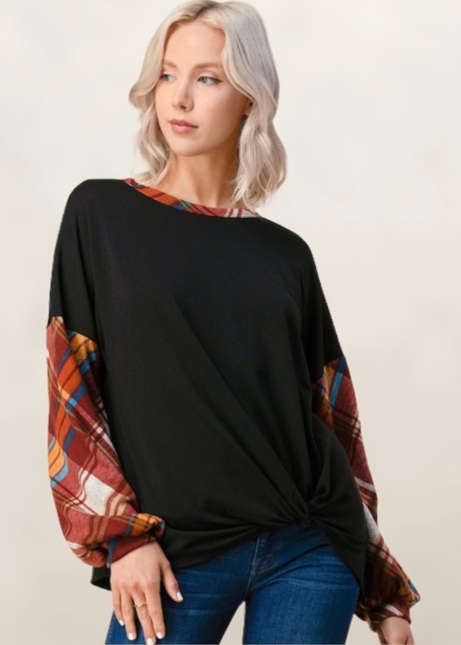 Cozy up and become engulfed in this highly ranked plaid detail sweater. It is black with a cute knot detail on the front. It is accented with plaid sleeves and a plaid collar, paying omen to the Scottish Clans. It is super soft and has puffed sleeves. It has a relaxed fit for ultimate wear and comfort. It can be styled with a scarf, jeans, and earrings for a casual, refined look.