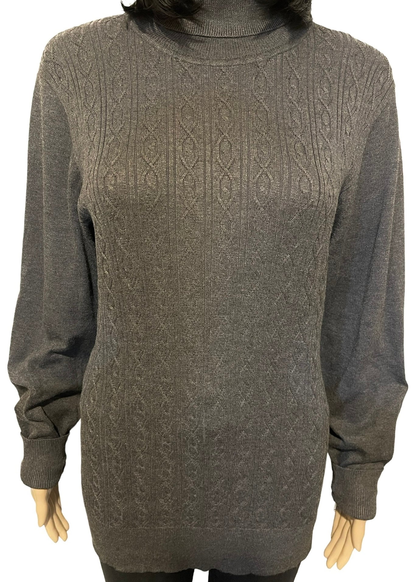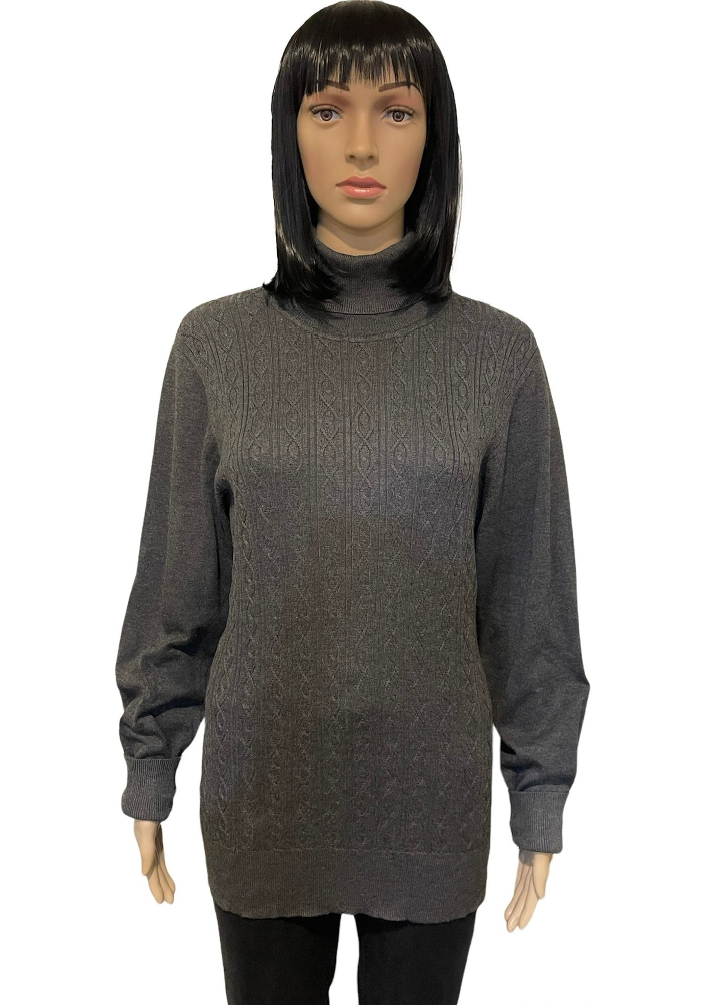 Get ready to zip through the fall and winter season in this charcoal turtleneck sweater. It has a beautiful cable knit design on the front, which provides intricate detailing. It has ribbing at the neck, hem, and cuffs for added detail and texture. This sweater can be dressed up or down depending on the occasion. Pair with it a long necklace and a scarf with jeans and boots for a casual yet refined look. You can roll the sleeves at the bottom for a styled look, or wear them unrolled for a more traditional look. Make getting ready for those chilly fall and winter days a breeze in this charcoal turtleneck sweater.