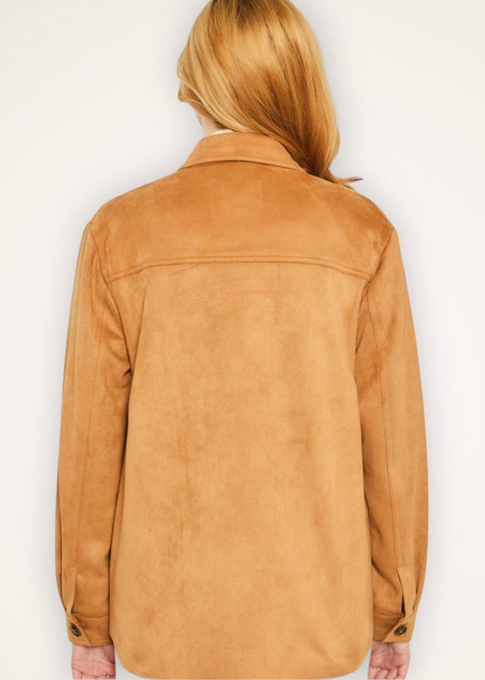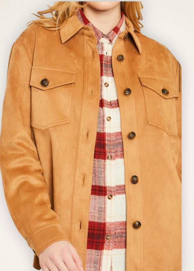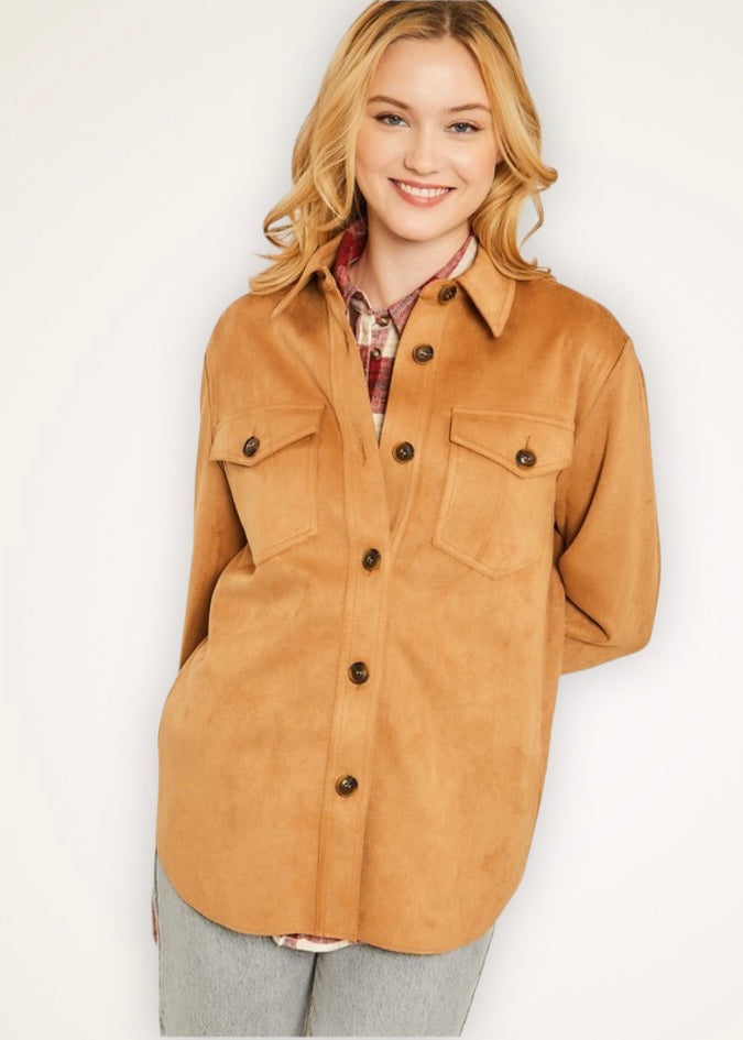 Take your layered look to the next level with this camel faux suede shacket. It has a button-down shirt silhouette and two flap pockets on the chest. It is lightweight and versatile creating an endless amount of styling options. Wear it over a sweater or flannel in the colder months or a tank or tee in the warmer months. Transform your day look into night by layering it over a dress or by wearing it with trousers. The sleeves have a single button on the bottom so they can be worn traditionally or unbuttoned and rolled or scrunched for a more dramatic look. The shacket is definitely the quintessential layering piece of the fall and winter season. Have fun creating your desired looks and let your creativity take you every little step of the way.