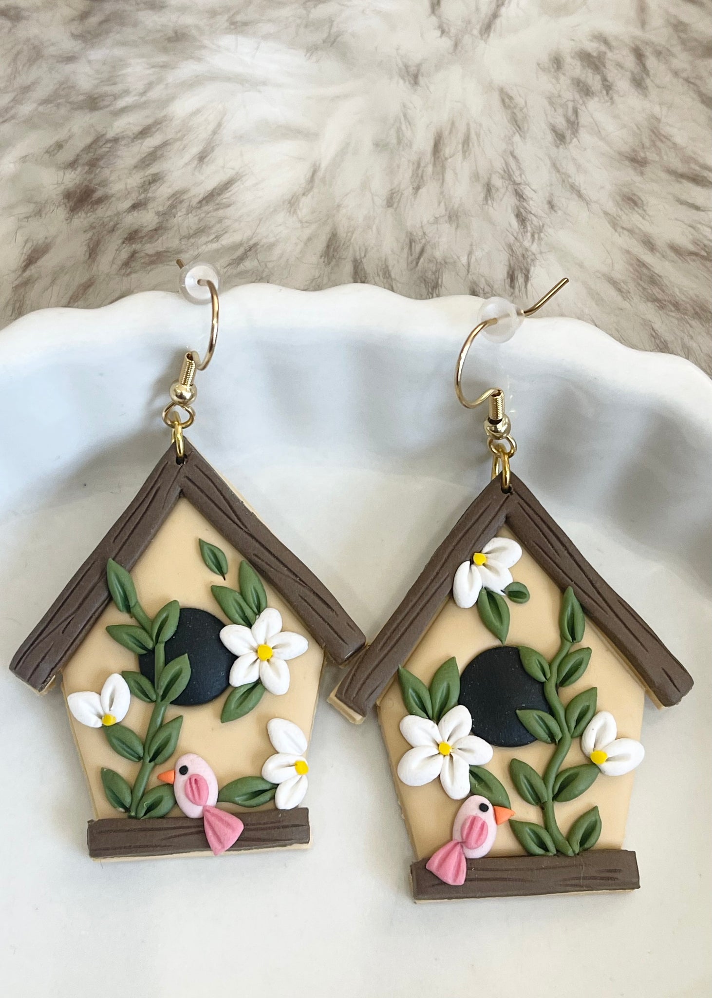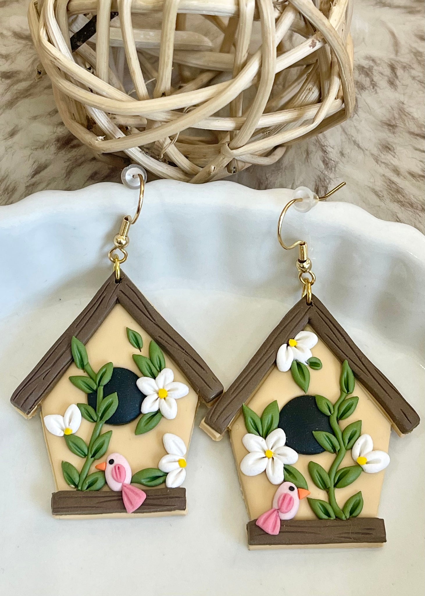 Are you obsessed with birds and beam over the thought of being in nature? Show off your love for the outdoors by wearing these adorable and unique birdhouse earrings. They are handmade and sculpted right here in the U.S. They have such amazing details and precise features. They are adorned with pink birds and green plants with white flowers. They are set on gold hooks and are lightweight, making them ideal for every earring lover. Beam with excitement and feel like you are on cloud nine modeling these precious birdhouse earrings.