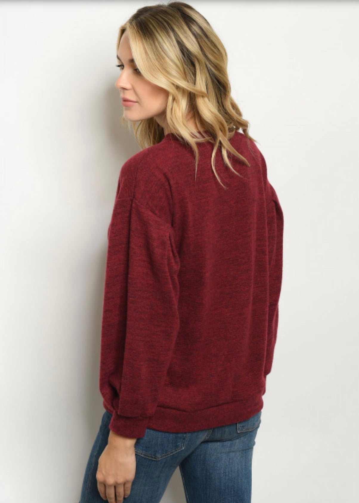 Are you into simple fashion? If so, this cozy burgundy sweater is for you. It has black streaks going throughout for added dimension. It has long pleated puffed sleeves for added detail. It looks great with medium wash distressed jeans or black jeans. In the winter show off your styled look by adding a coordinating scarf, jewelry, and boots. Show the world that simple styles can turn heads too.