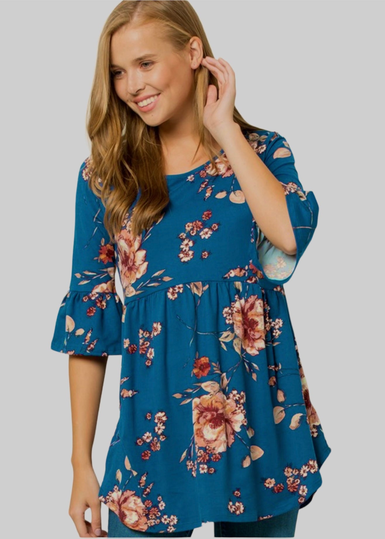 Prosper in your feminine power with this charming teal, floral print tunic. It has a pretty all-over floral print in warm, earthy colors. It is a babydoll style, making it nice and flowy at the midsection. Since it is a tunic with a high-low hemline, it is ideal to wear with leggings or jeans. It has an elbow length, ruffled bell sleeve that adds the perfect amount of feminism. It is made from soft, stretchy, knit jersey material that feels so comfortable on your skin you will forget you are wearing a top. Go out and enjoy your lunch date in this sweet little floral tunic.