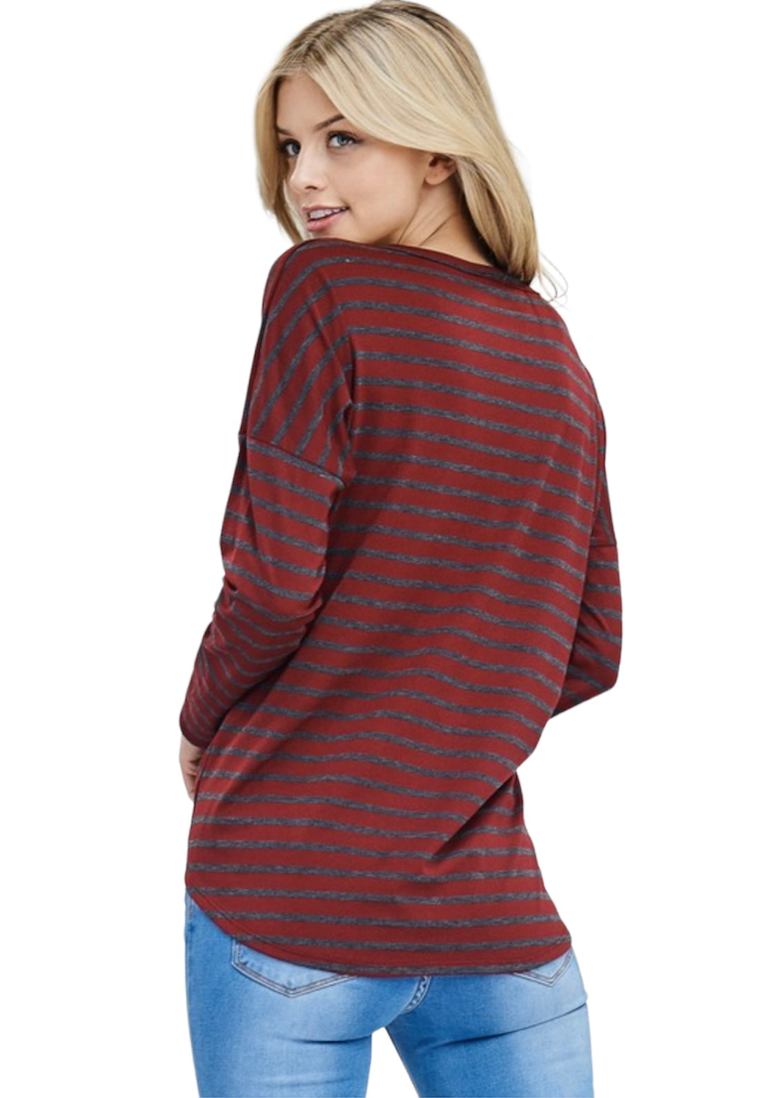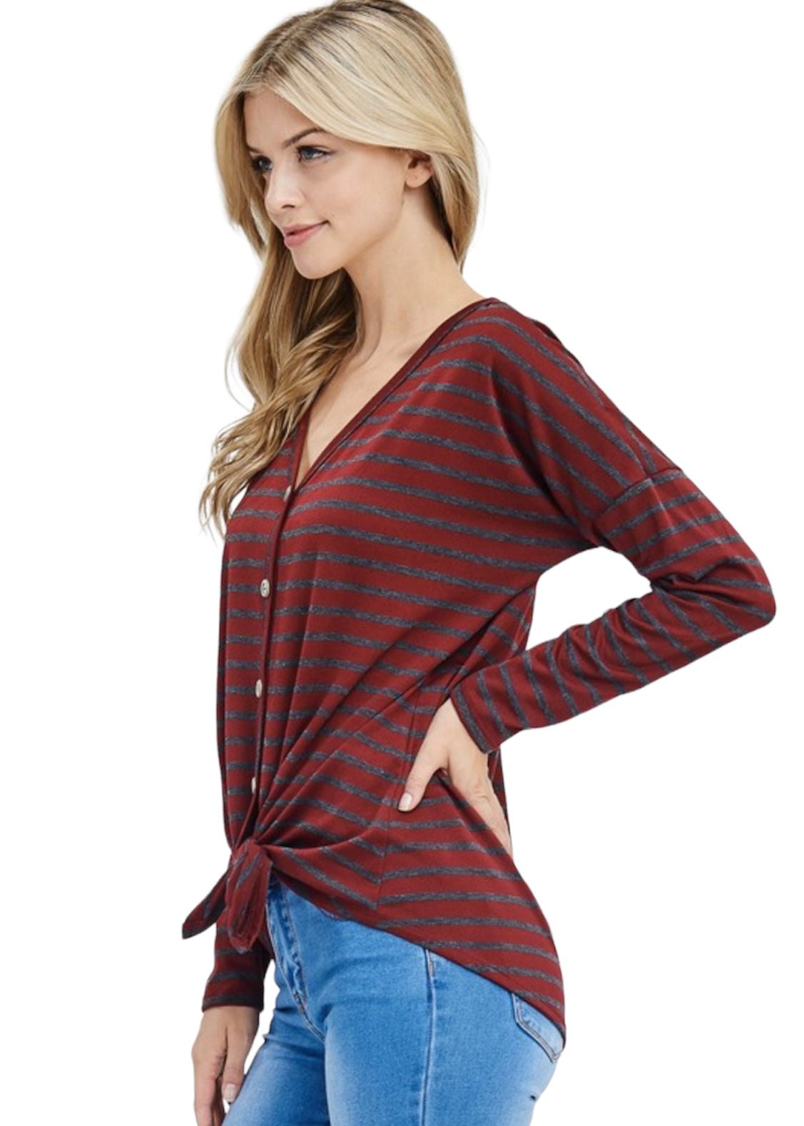 Get ready in a moments notice with this burgundy striped pull-over top. It has dark gray horizontal stripes, which can make you look thinner, and a flattering v-neck. It has a faux button detail that goes down the center with a tie front. The tie front adds interest to your look without having to front tuck or wear a belt. It is long sleeve and medium weight, making it perfect for the fall season. Layer it with a denim jacket or oversized shacket for an extra layer of protection in the winter. Style it with a pair of dark gray jeans and a wedge sneaker for an edgy casual look. Look and feel great going about your day in this amazing burgundy striped top.
