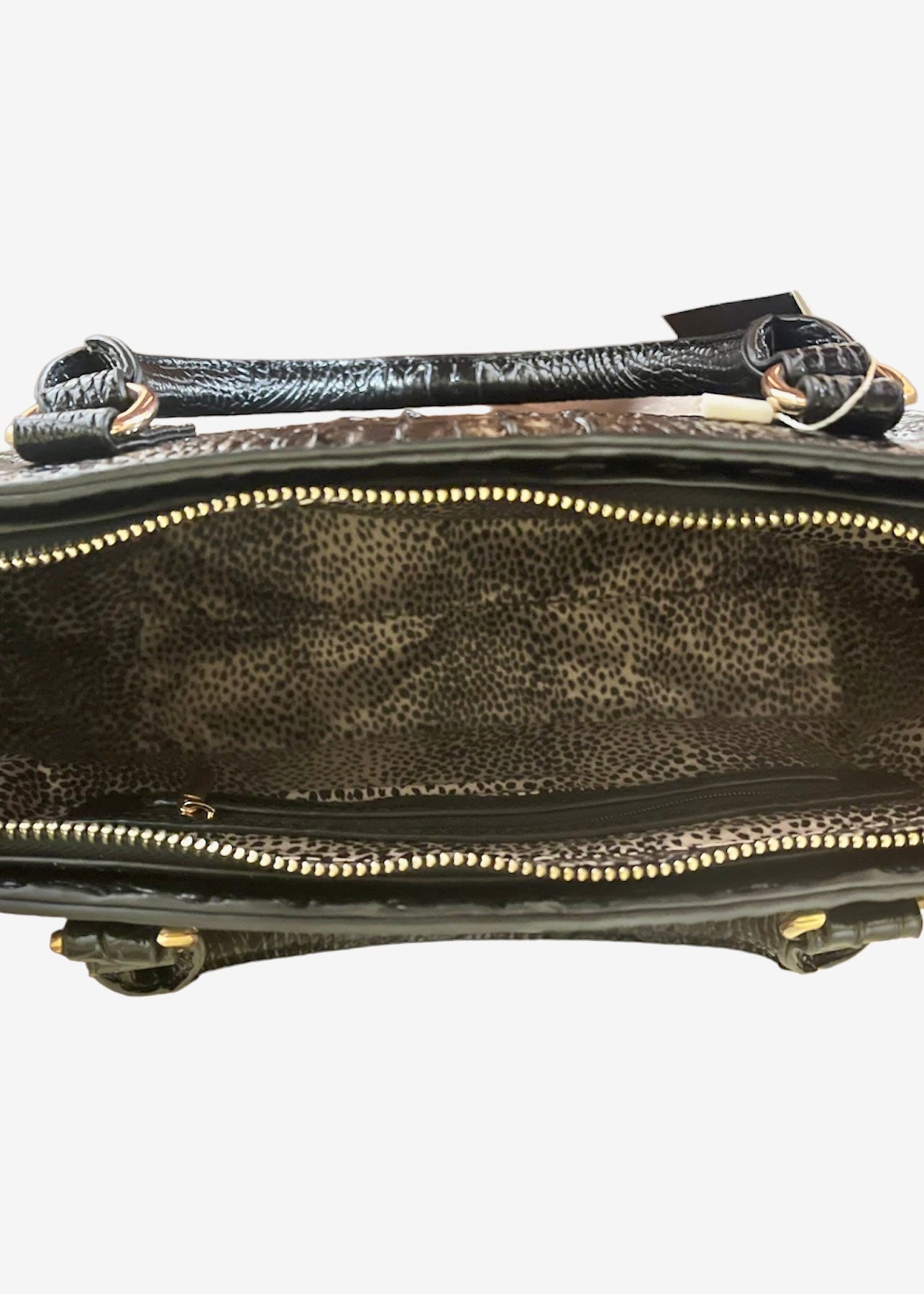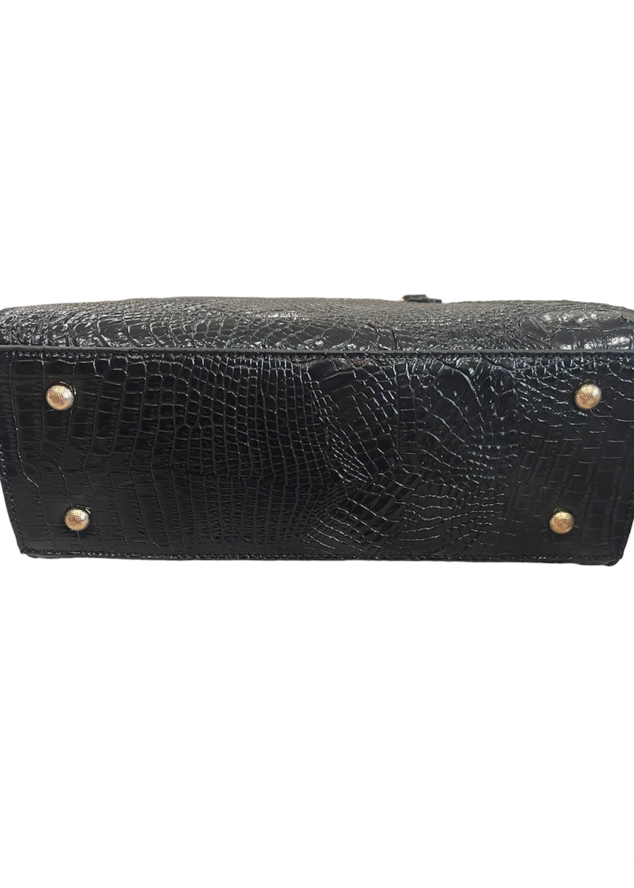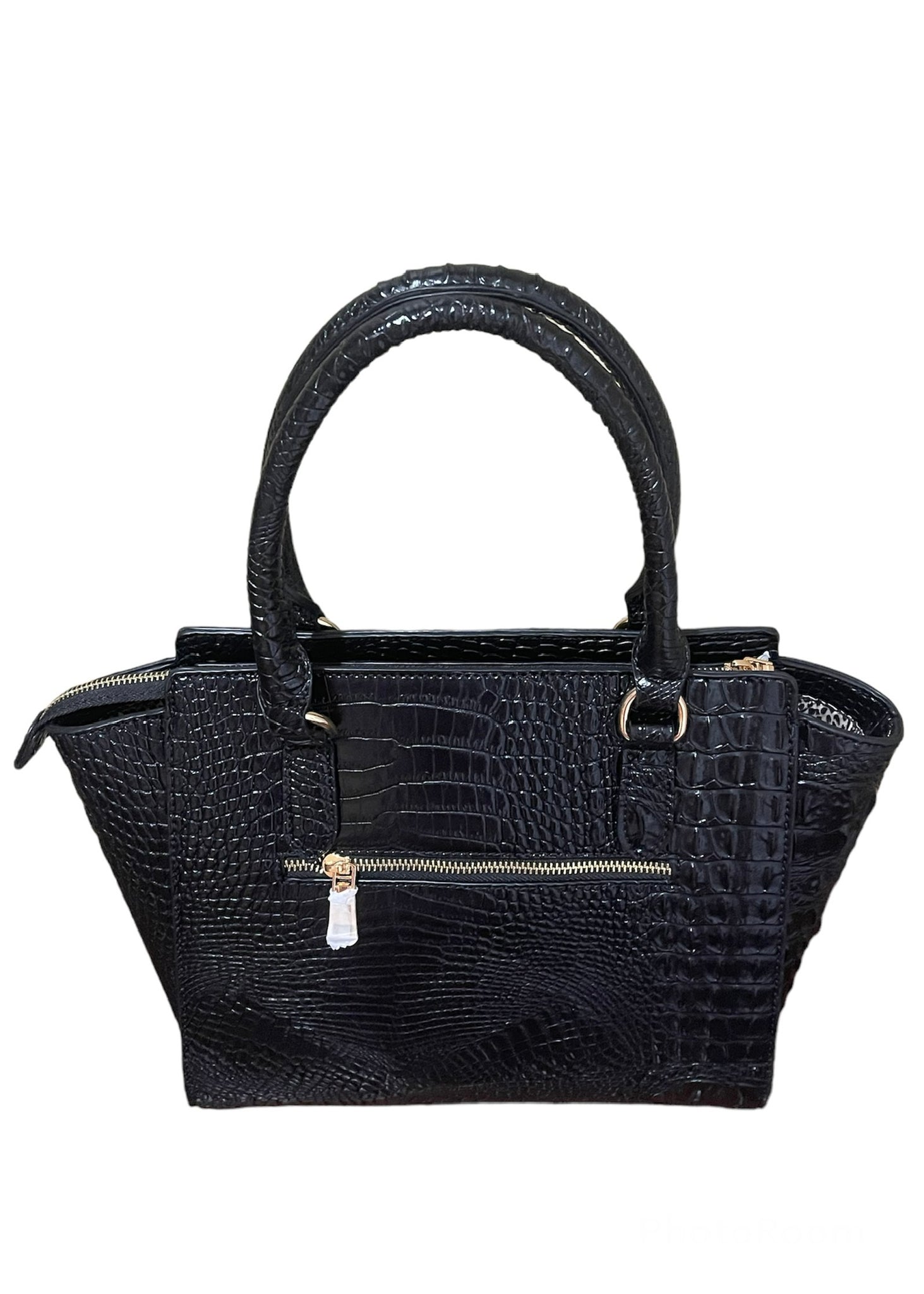 Get ready to draw an overwhelming amount of attention with this striking black crocodile print handbag. It is solid black with an all-over distinctive crocodile print. It is made from vegan leather which provides durability and low maintenance while being animal friendly. It has shiny gold hardware and zippers for a more luxurious look. The inside is lined in a beautiful tan and black animal print fabric. It is is very spacious inside, roomy enough to hold all of your necessities and extras. It has several zip and slip pockets on the inside as well as a zip pocket on the back for extra storage. It comes with a detachable shoulder strap which allows for flexibility on how you would like to carry it. Carry it with all of your favorite outfits to further advance your look and be in awe over the instant attraction.