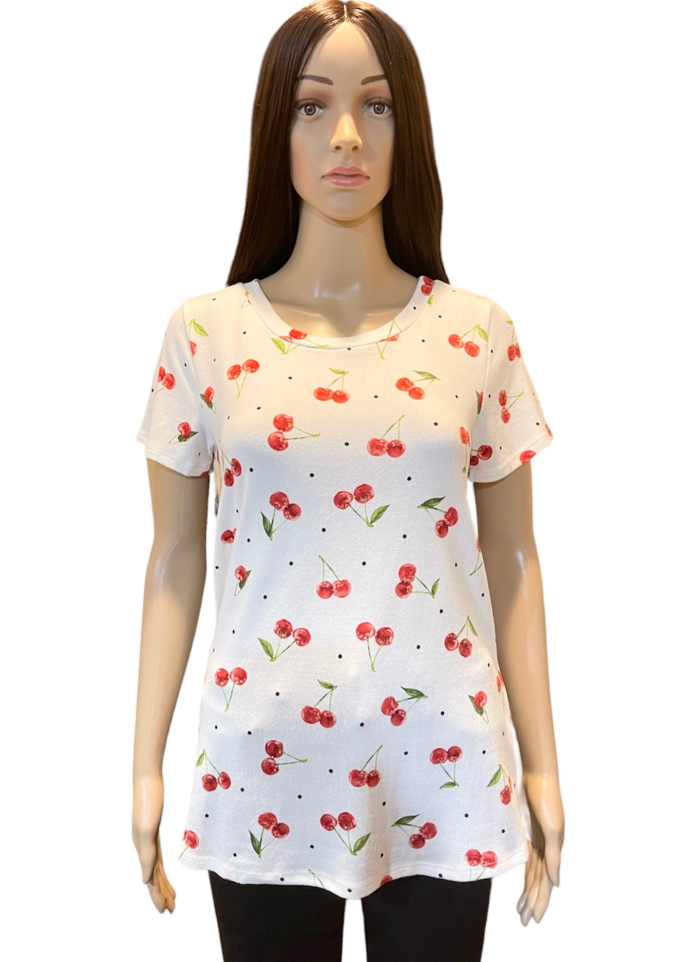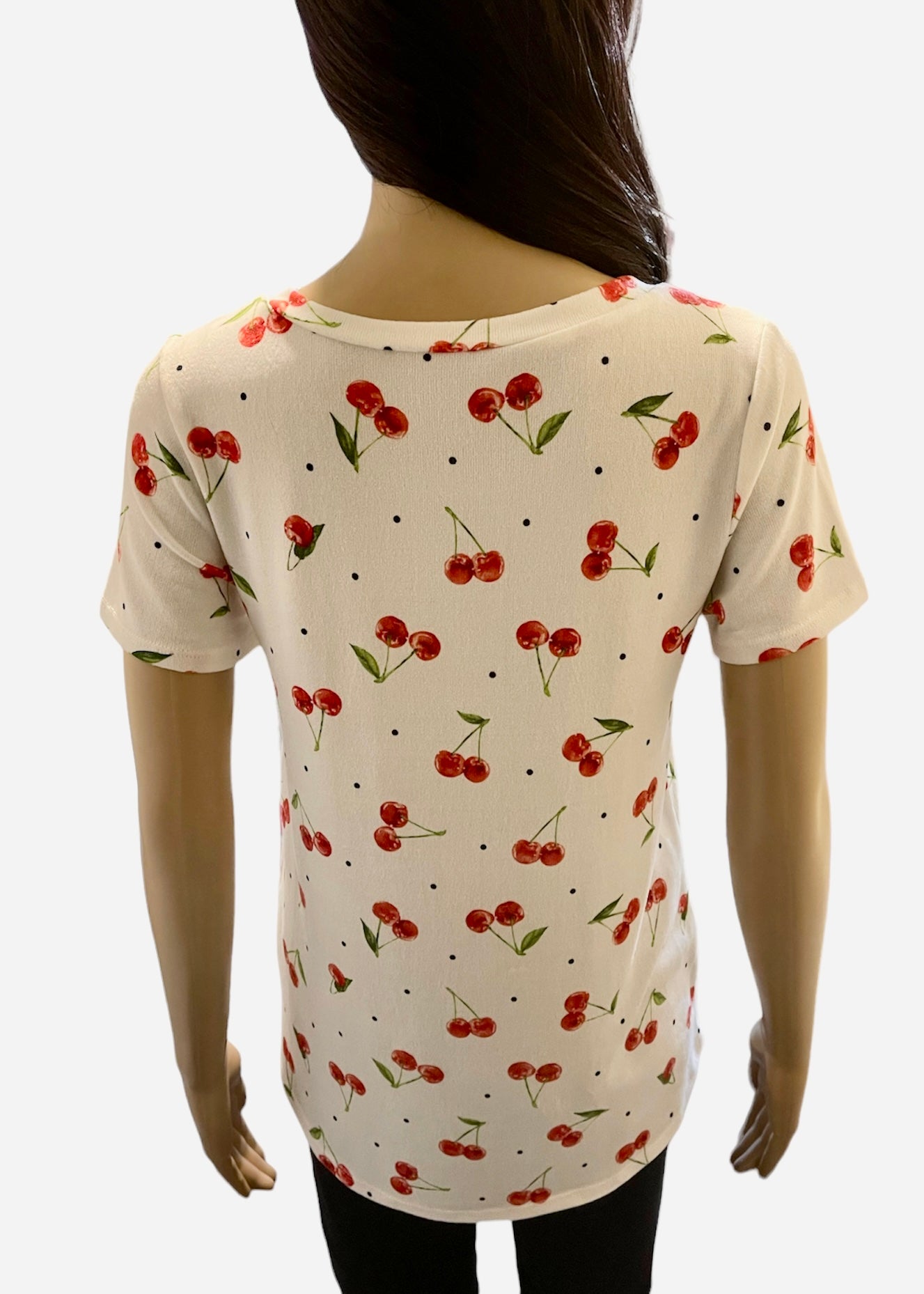 This summer this cherry print top will have you feeling fruity and fresh! Enjoy this unique white top with a bold cherry print and black polka dots. It has short sleeves and is semi-sheer, making it perfectly cool for the humid summer months. It is so soft and gentle on the skin, creating a perfect pick for the summer season. Pair this sweet top with black or red shorts and sandals for the cutest summer look.