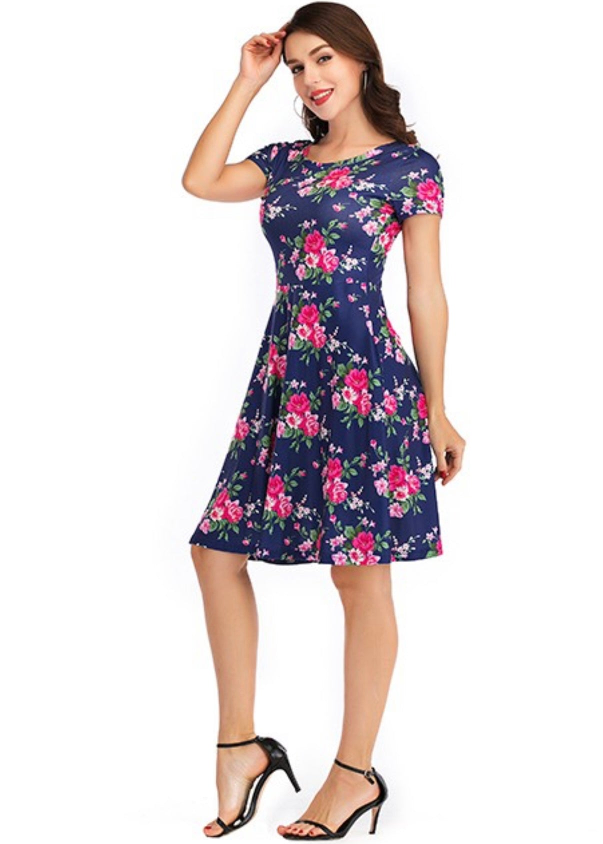 Get ready to bask in the beauty of spring and summer in this beautiful navy floral print dress. It has vibrant shades of pink and green that really make it stunning. It is a fit and flare style, making it perfect for every body type. It has short sleeves and is made from soft, stretchy material, making it a breeze to wear all day. Style this beauty with flat sandals or open-toed heels or wedges for a dressier look. It is very versatile so you can wear it to a wedding, church, or on a date. Look your best and dress for success in this must-have navy dress.