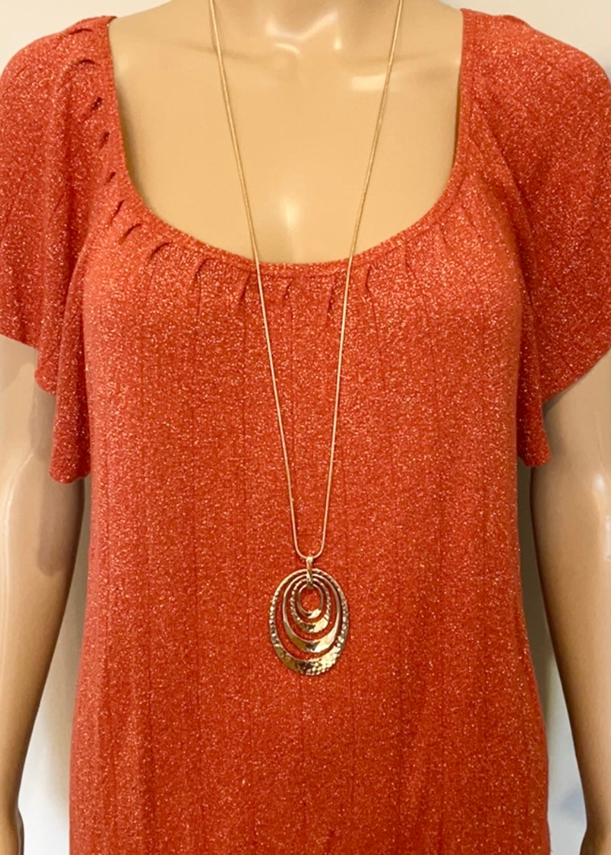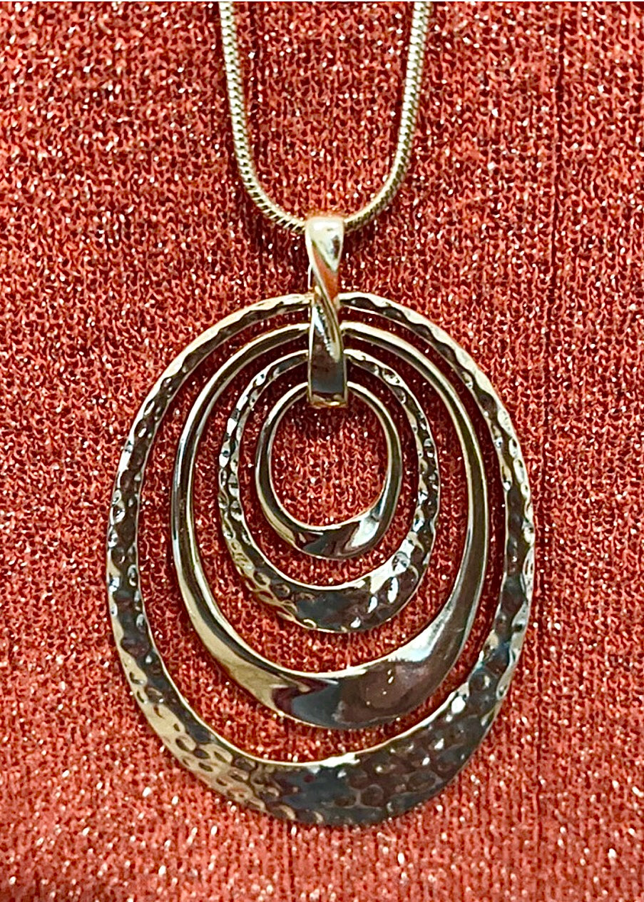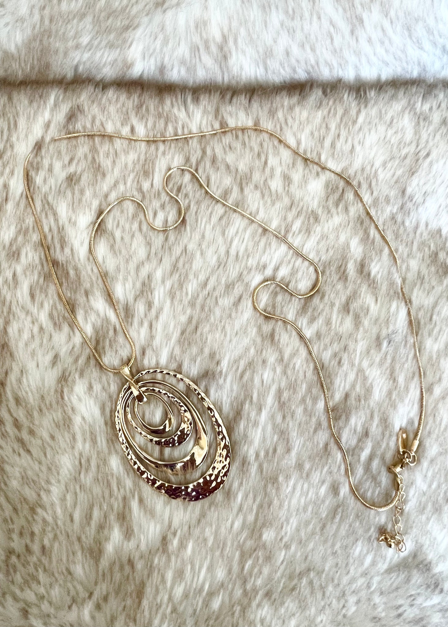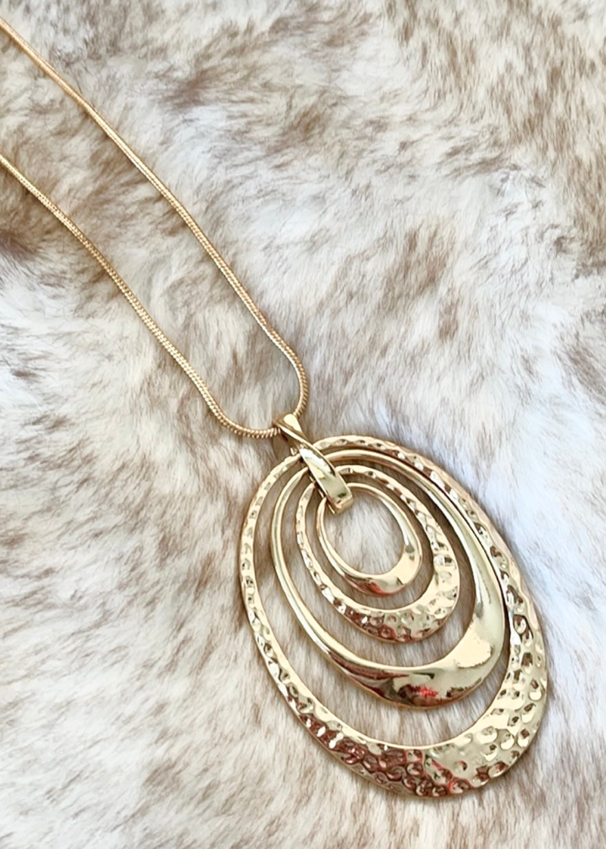 Do you get really excited when you find unique jewelry pieces? We do and love every minute of it! This long gold necklace is the perfect everyday piece that will go with just about everything. It is a multi-tiered oval shaped pendant that has both smooth and hammered gold loops. It is on a long gold chain that has an extender so you can adjust the length accordingly. Simply pair this necklace with any outfit to add a distinctive look to your attire.