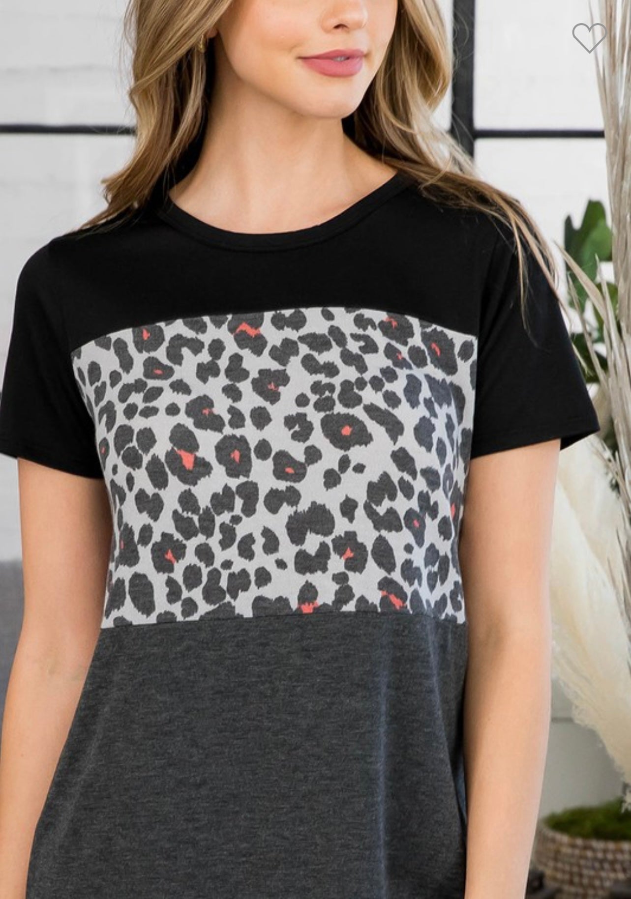 Show off your wild side with this leopard print color block top. It is black at the top, followed by a leopard print block going across the chest. Under the leopard print is a heathered gray block followed by a gray and white striped block at the bottom. It is slightly sheer making it cool for the summer months. It is so trendy and can be worn with an array of bottoms. Pair it with black or gray jeans or shorts for a stylish summer look. If you love leopard print and are looking for a more subtle approach, then this top is for you.