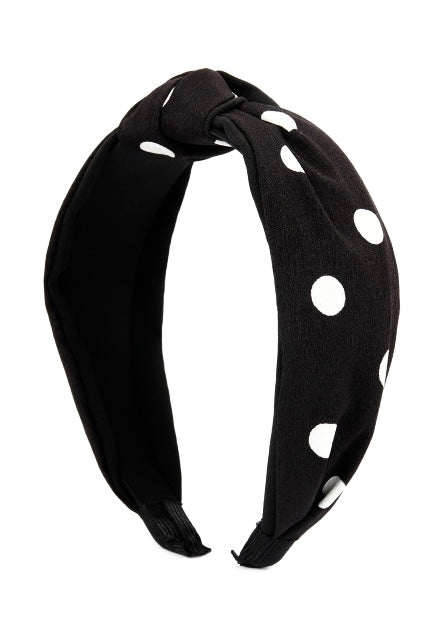 Show off your sweet side with this super cute black and white polka dotted headband. It has a sleek knot tie at the top and solid black ribbed tips at the bottom. It is a wider headband so it shows off the playful yet simple design. It is very versatile and can be worn with any hairstyle, up or down. Add a bit of sweetness to your hair with this black polka dotted headband.