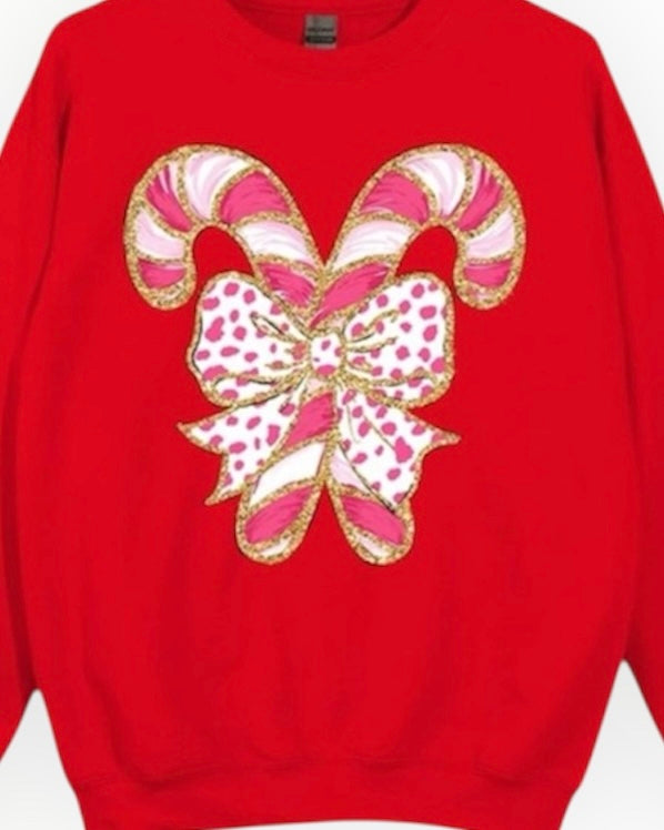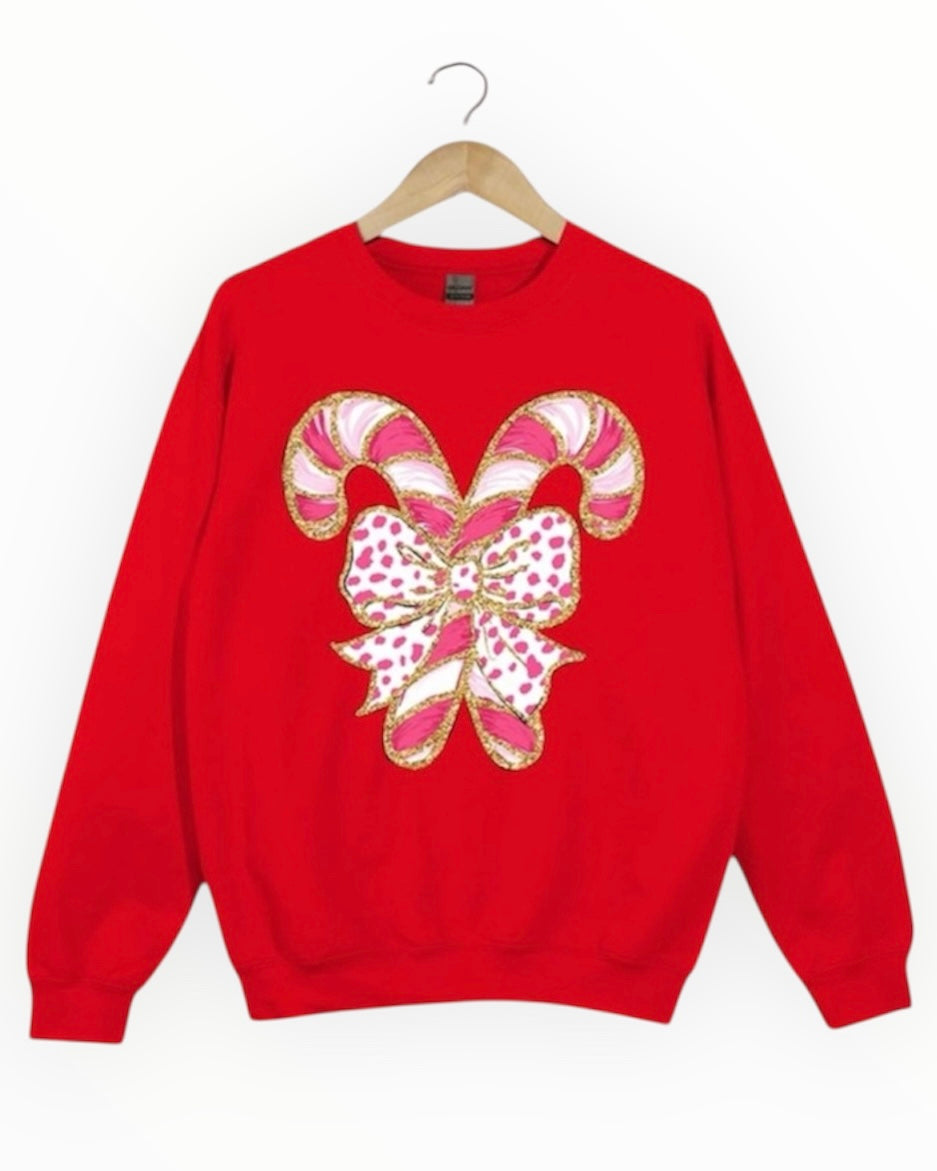 Get into the holiday spirit with out Ode To Joy Candy Cane Sweatshirt! Featuring a festive double candy cane graphic with a playful bow detail, this bright red fleece sweatshirt is perfect for spreading holiday cheer. And don't worry, the faux glitter coquette adds a touch of sparkle without the mess. Pair it with jeans or leggings for a cheerful relaxed look. Tis the season to be cozy!