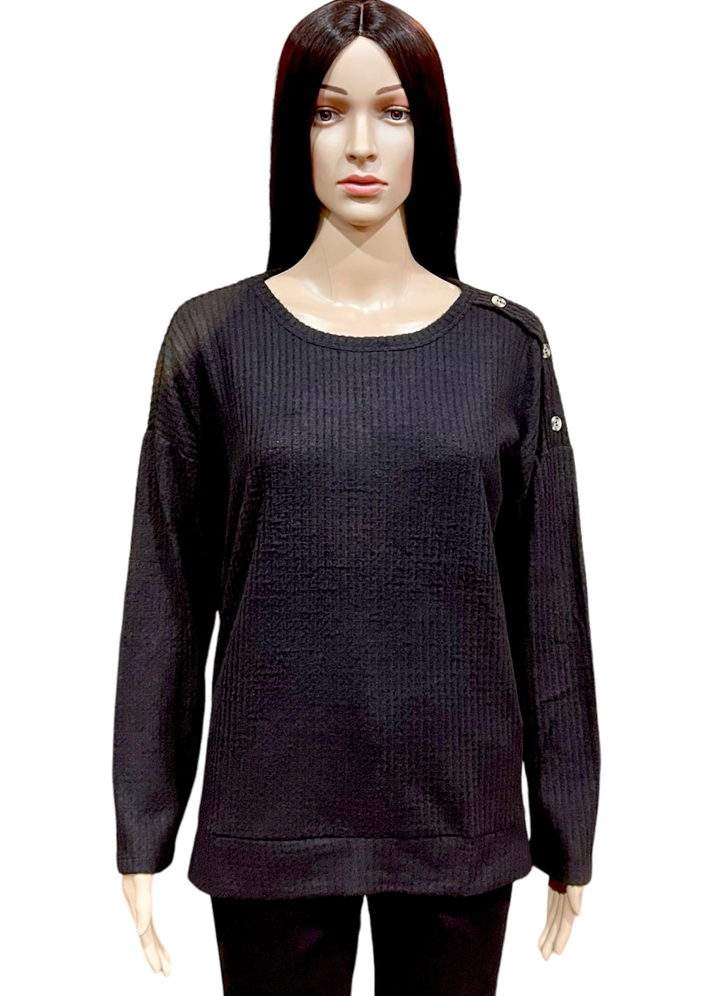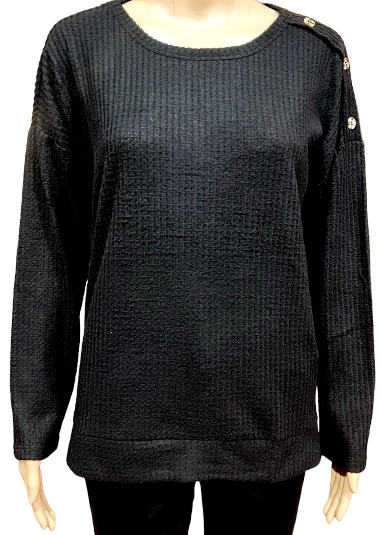 Get cozy in our More Then Enough Black Sweater. With its soft waffle knit fabric, this black sweater is perfect for the winter and fall seasons. The added shoulder buttons add a touch of style, making it both comfortable and chic. Elevate your look and show off your one-of-a-kind personality by accessorizing to your unique taste. Add some colored jewelry for a dramatic flair or add a rare scarf to create a bold look. Who says you can't have it all? Certainly not us!