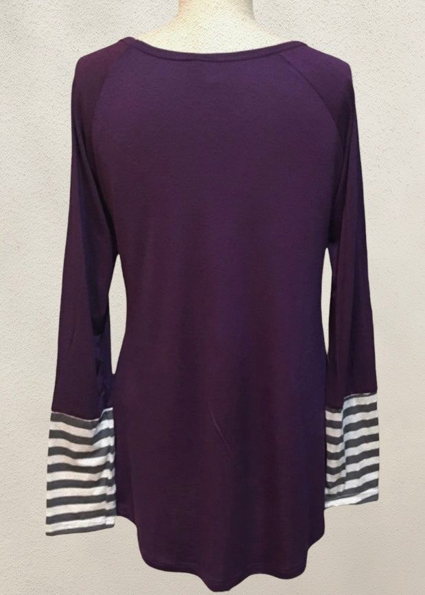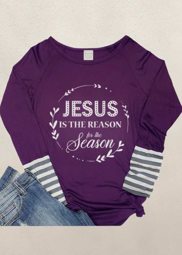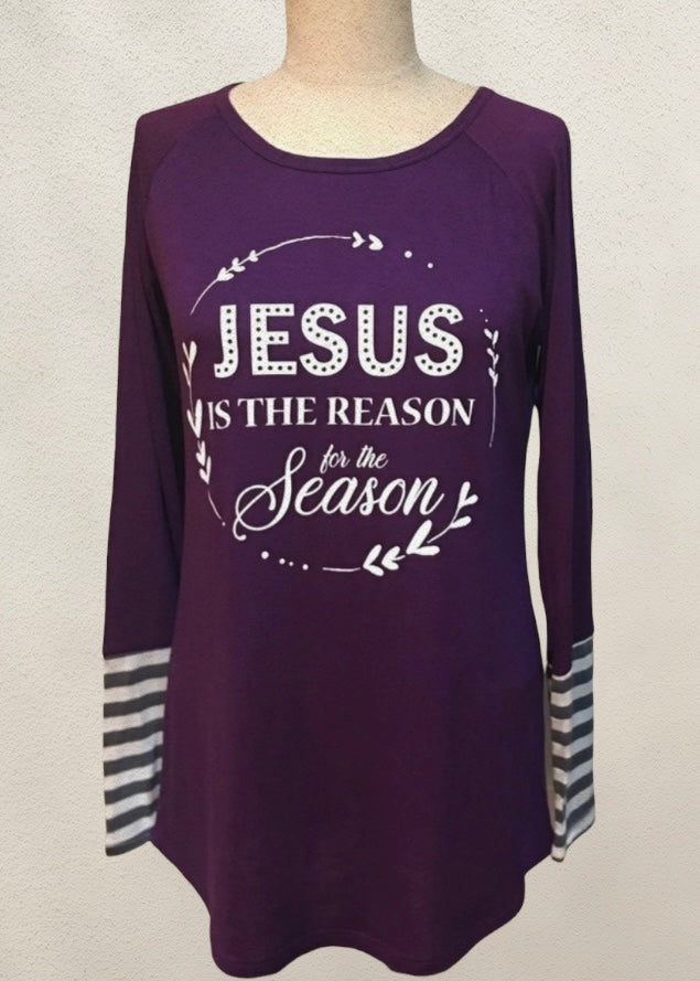 Profess your love for Jesus by wearing this cute, purple, long sleeve tee. It is a deep plum color with a white graphic design on the front that says “Jesus Is The Reason for the Season”. The bottom of the sleeves are gray and white striped which adds a nice contrast. It is made from soft, stretchy, lightweight material making it a perfect piece all year round. It looks super cute with gray leggings or tied in a side knot with jeans.