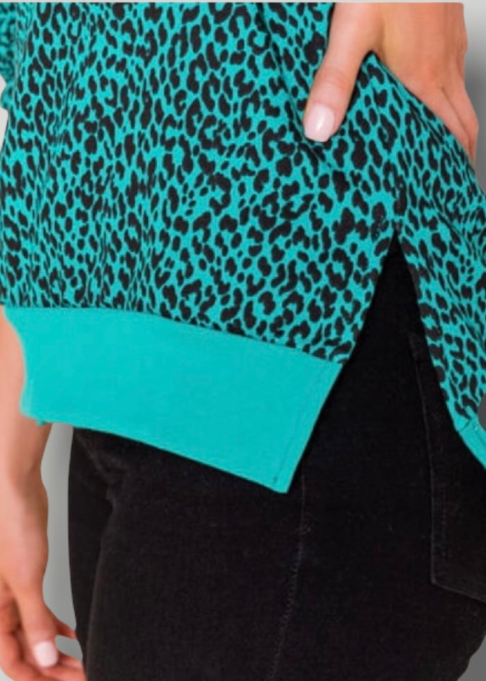 Do you have an obsession with all things animal print? No worries, we do too! Fulfill your undying love with this fabulous animal print sweater. It is teal with an all-over black animal print. For added detail it has a solid teal band at the bottom hem and bottom of each sleeve. It has two side slits and a hi-low hem at the bottom. Pair this sweater with some black skinny jeans and booties for an effortless, chic look.