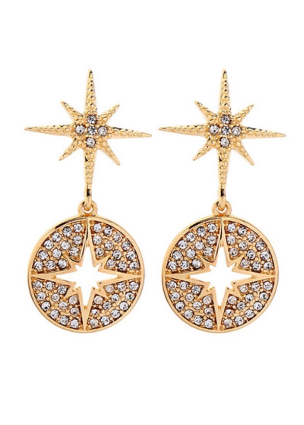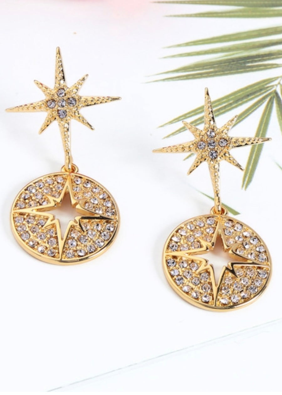 Show off your star qualities with these gold crystal dangle earrings. They are a shimmery antique gold with two eight point stars. One is positioned at the top while the other one is engulfed in a round charm at the bottom. They are accented with crystals that give them a regal feel. The beautiful cut out star design along with the sparkle of the crystals really make these stunning. Dress up any outfit with these amazing earrings and turn your outfit from drab to fab.