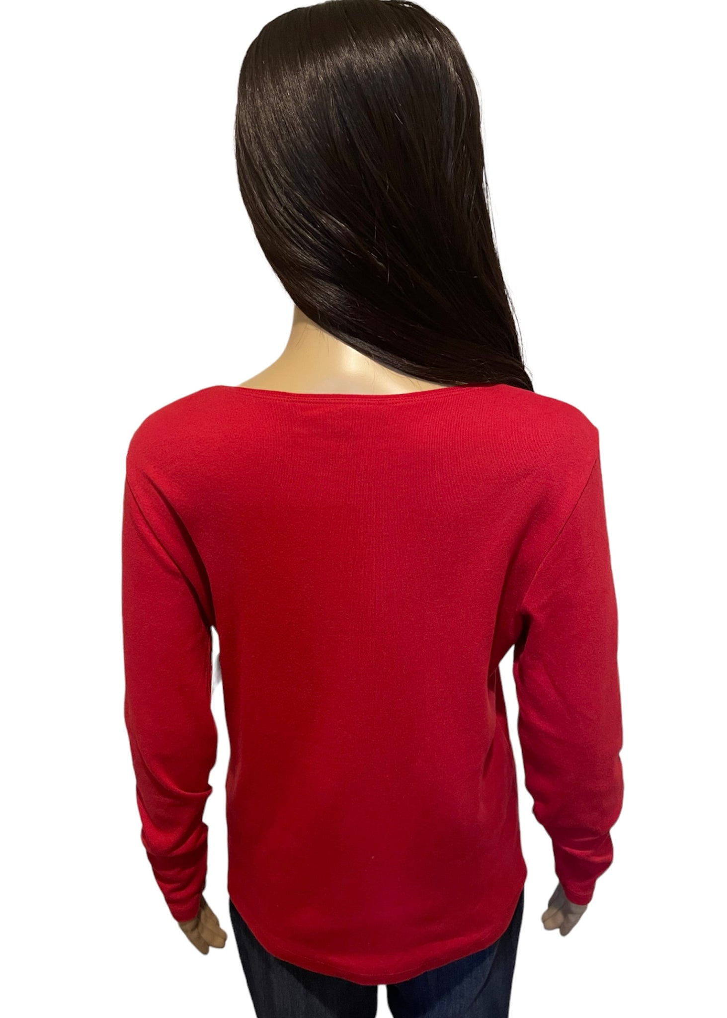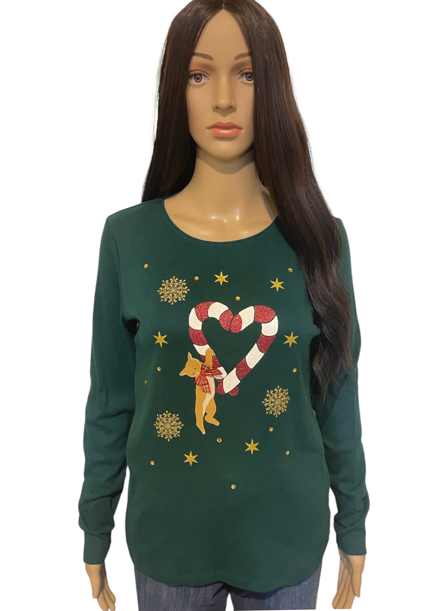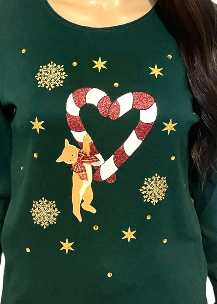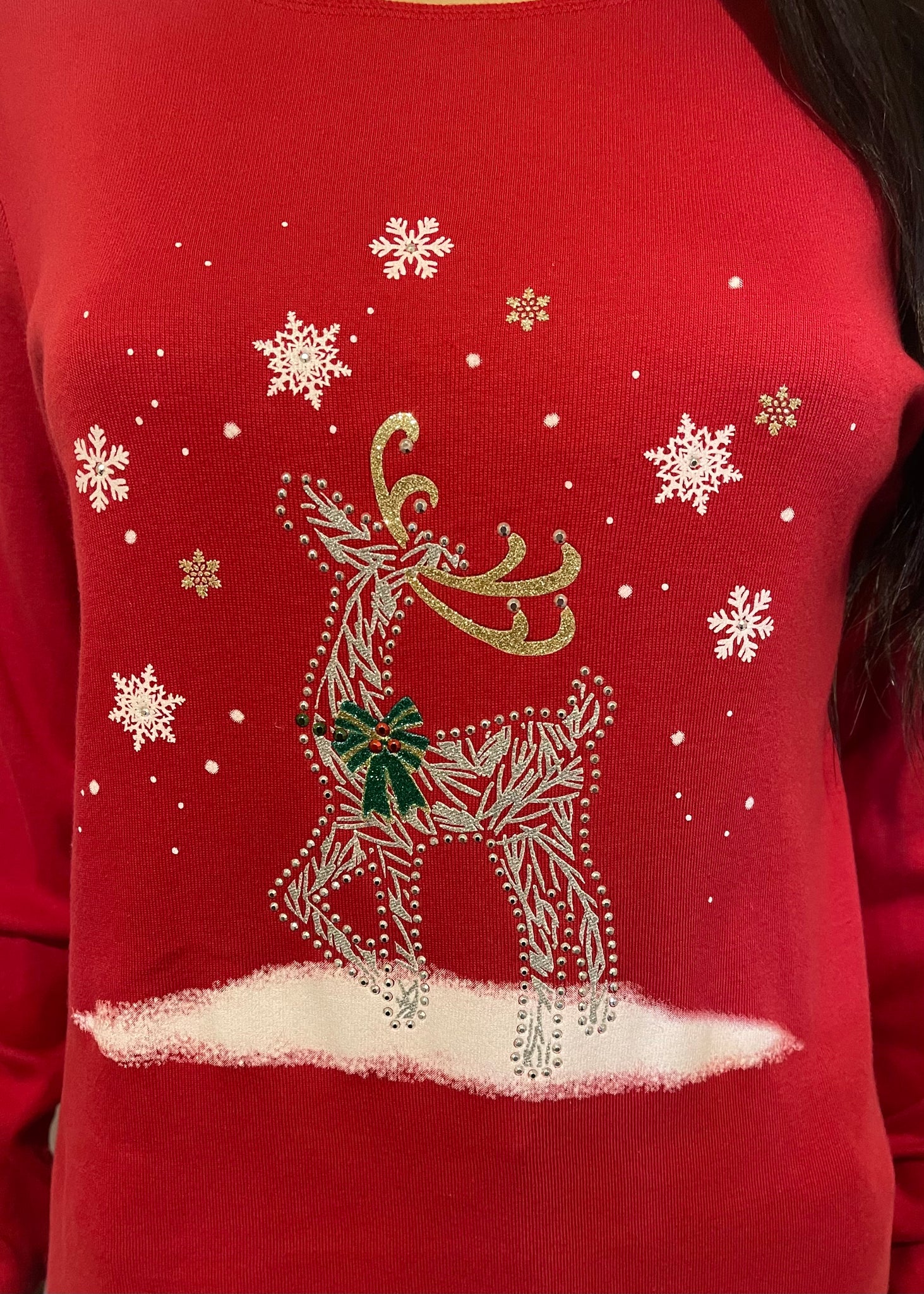 Are you ready for all the comfort and joy that the holiday season brings? Get in the spirit with these cute festive holiday tops. They are unique and have an embellished holiday design on the chest. The dark green one features a cat holding a maroon and white striped glitter candy cane joined with a second candy cane making a heart. The cat is wearing the cutest plaid bow around it’s neck. It is embellished with gold glitter stars, snowflakes, and rhinestones. The red one features a gold and silver glitter reindeer that has a green and gold bow at the neck, surrounded by white snowflakes. It is also embellished with rhinestones. Spread some holiday cheer at a holiday party or family gathering in these fun and bright tops.