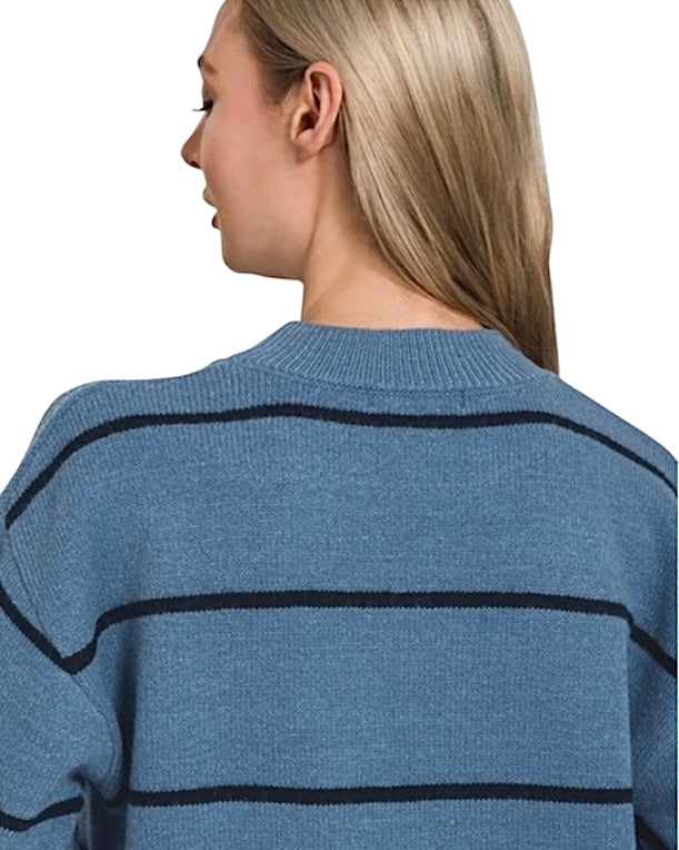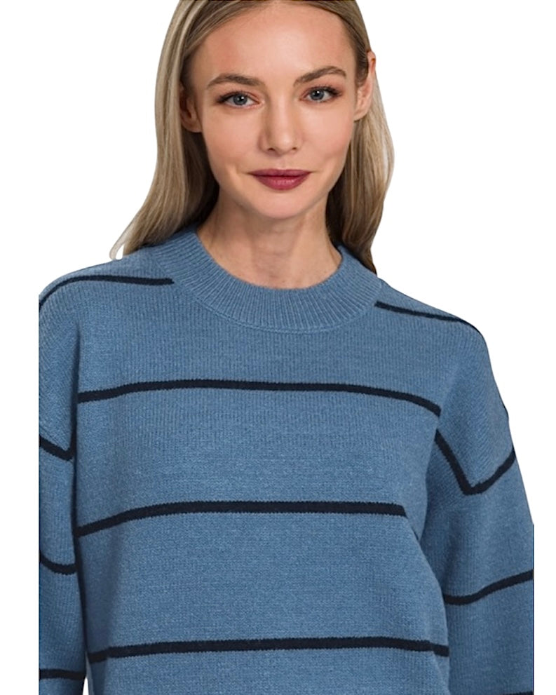Meet your new winter bestie: the Never Say Never Striped Sweater! This light blue beauty with classy black stripes is like a warm hug that says, “Bring on the snowflakes!” It has a round neck with ribbed detailing as well as ribbing on the sleeves and bottom hem. The ribbed detailing adds a dash of flair and texture. It is a heavier weight so it will keep you toasty, making this sweater a cozy companion for chilly adventures or late night outings.