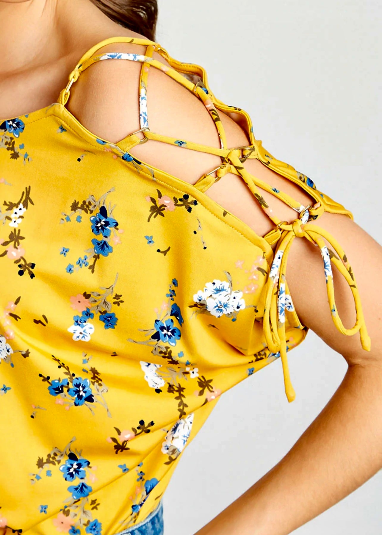 Get ready to beam in this bright yellow floral blouse. It is yellow with a pink, blue, white, green, and brown all over floral print. It has short, criss cross, lace-up sleeves that add a lot of personality and style. This blouse has a relaxed fit at the top and gets more fitted at the bottom. It is made from soft stretchy material that will keep you comfortable all day. It looks great with jeans, shorts, or a skirt. Wear it tucked in or out, the choice is yours. Either way, you will stand out and exude happiness in this beautiful yellow blouse.